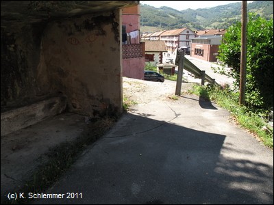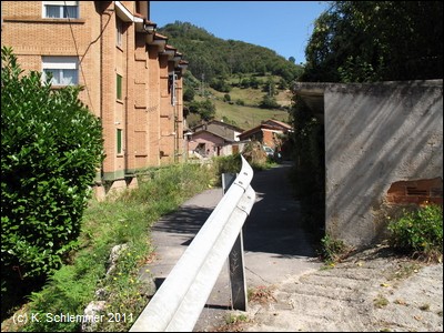 In Ermangelung einer eindeutigen Hinweistafel oder eines Wegweisers starten wir an der alten Eisenbrücke über den Río Caudal zwischen Ujo und Figaredo. Nach kurzer Fahrt von nicht einmal 500 m auf der alten Bahntrasse muss innerorts die As-242 überquert werden (Blick zurück).