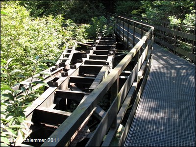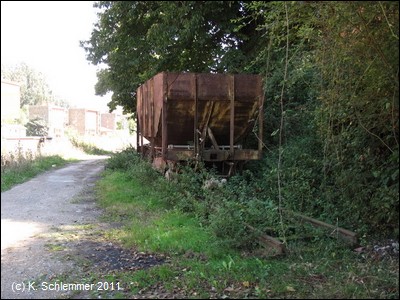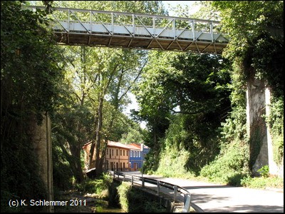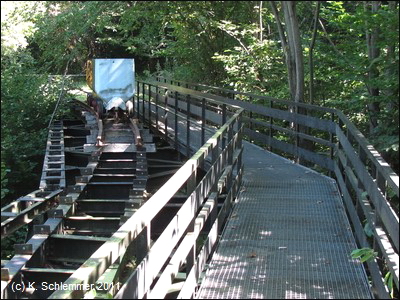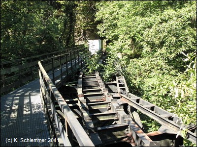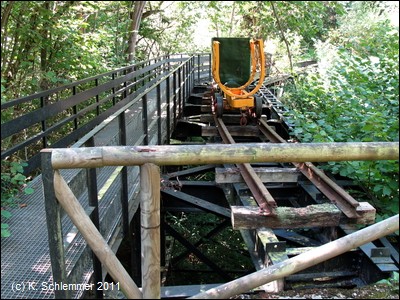 Ein tiefer Einschnitt liegt hinter uns. Die Eisenbrücke mit den alten Loren hat eine merkwürdige Form: Die Konstruktion ist eckig, die Gleise sind aber (natürlich) in einem Bogen verlegt.