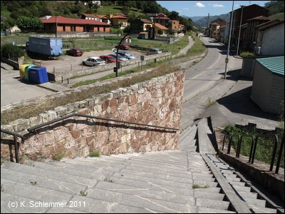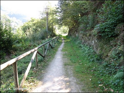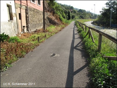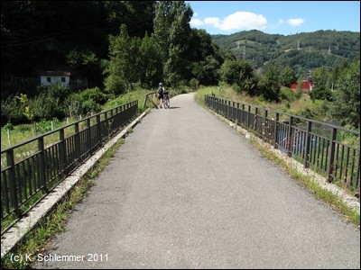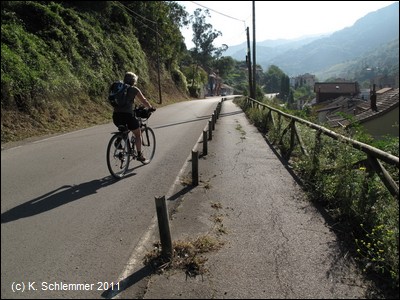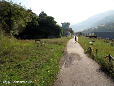 ....und endet an einer Treppe. Auf der anderen Straßenseite erkennt man schon den Radweg Richtung Berge. Ein schön asphaltierter Abschnitt folgt der Straße - nicht ganz ohne gefährliche Stolperfallen!