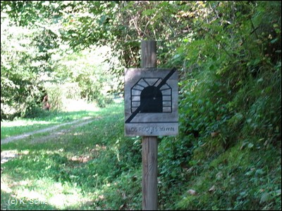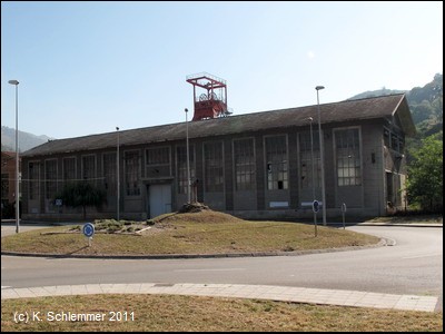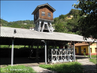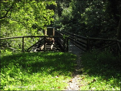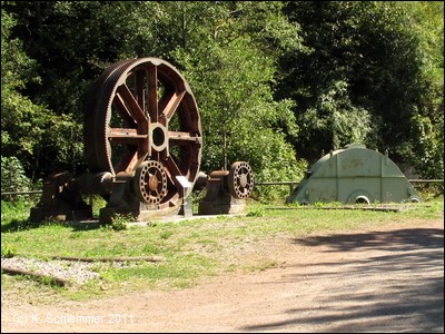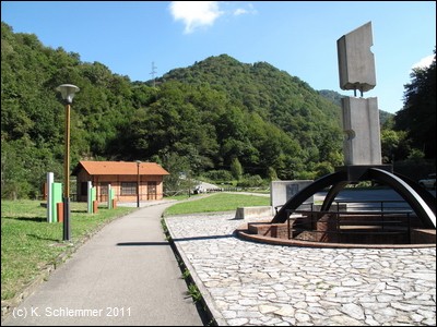 Der Weg knickt nach rechts ab, wir wechseln auf die andere Flussseite. Auf einenm asphaltierten Weg erreicht man die Grube Fortuna. Über einem Schacht wurde ein Denkmal errichtet.