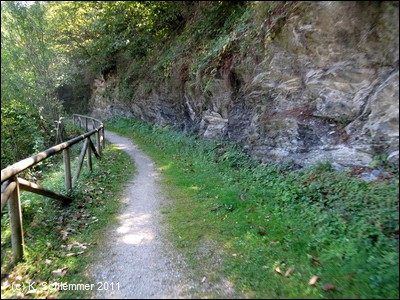 Wir folgen einem schönen Pfad am Felshang entlang. Wir sind auf Höhe der rostigen Fördertürme.