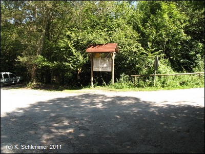 Noch einmal geht es durch den Wald, dann führt eine Rampe hinunter auf die Straße und zu einem Parkplatz (Blick zurück).