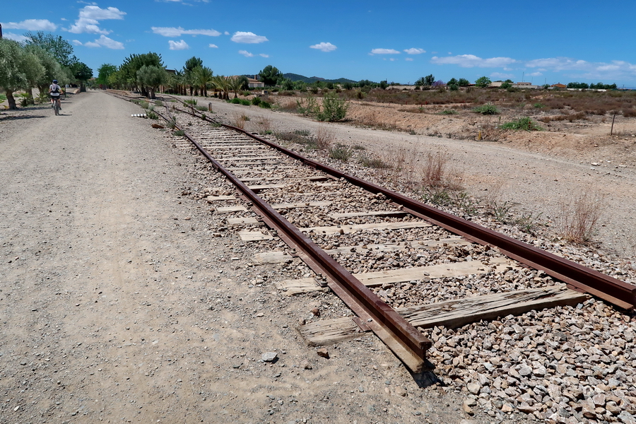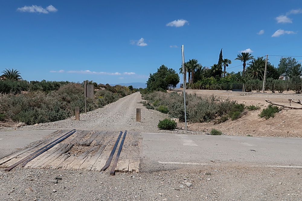 Recht ungepflegt führt die Trasse weiter Richtung Huercal-Overa. An der Kreuzung mit der Straße nach Las Norias liegen noch die Schienen in einem Holzbett.