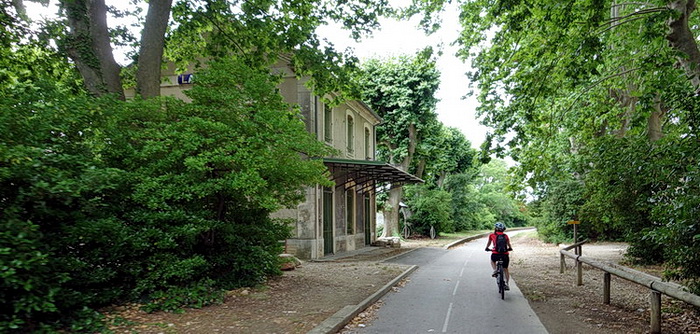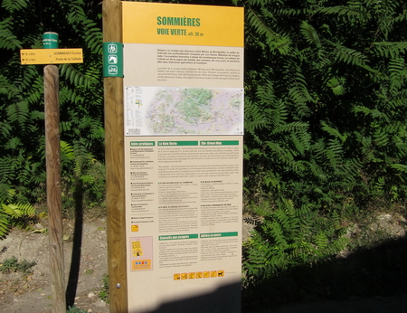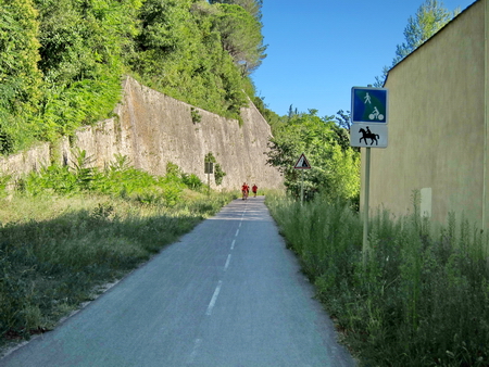 Der Bahnhof der stillgelegten Strecke nach Nîmes liegt etwas außerhalb des Kernstadt, hier befindet sich ein großer Parkplatz für die Besucher. Von hier aus führt die asphaltierte Strecke auf der ehemaligen Bahntrasse durch die südliche Landschaft in westlicher Richtung bis nach Caveirac, einem verschlafenen Ort ca. 9 km von der Großstadt Nîmes entfernt. Die frühere Bahnlinie führte weiter bis nach St. Césaire-les-Nimes (ca. 6 km), das inzwischen ein Stadtteil von Nîmes ist.