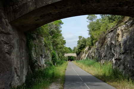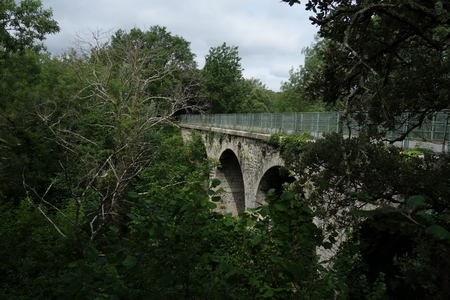 Der Radweg auf der Bahntrasse überquert die Senke und den Bach Rhony auf einer großen Brücke, gleich daneben befindet sich eine kleine, selbsttragende römische Steinbrücke: Pont d'Arnia.
