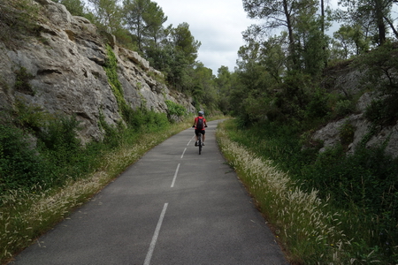 In einer Schleife führt der Radweg auf der Bahntrasse um die Hügel von Caveirac herum ....