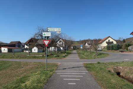 Vorbei am Rastplatz und der Schutzhütte zieht die Strecke kerzengerade weiter durch die Auen. Die Landstraße wird überquert (Vorsicht!), an den kleineren Querstraßen gibt es keine Barrieren. An diesen wenig befahrenen Straßen hätte man auch einmal dem Radweg die Vorfahrt einräumen können.