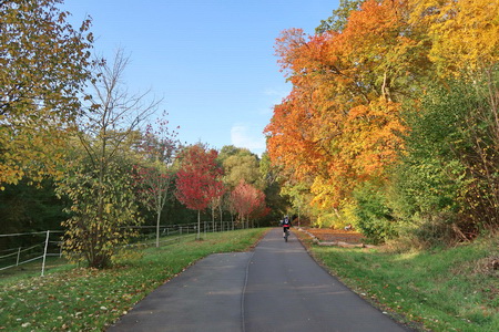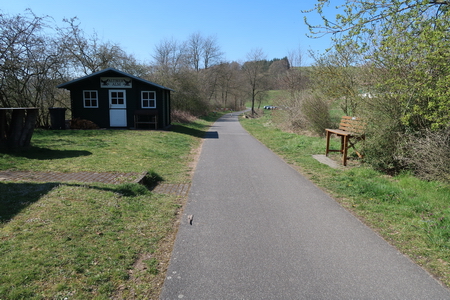 Der Weg steigt weiter an, am Hang entlang wird es etwas enger, Vorsicht bei Gegenverkehr! Dann erreicht man die Bahntrasse, die hier von einem Werksanschluss und dem ehemaligen Südbahnhof her einmündet. In einer Spitzkehre beginnt der Radweg auf der Trasse.