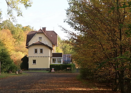 Ein schönes Häuschen mit einigen Eisenbahnrelikten im Garten.