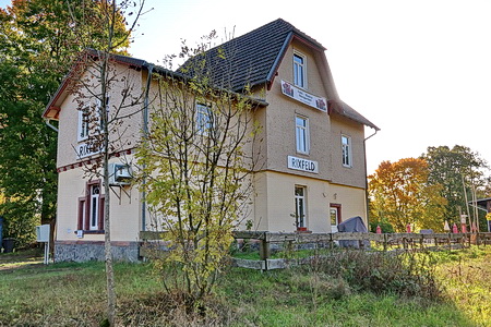 Der alte Bahnhof von Rixfeld, hier wurde ein Café eingerichtet (So. ab 14 Uhr ab März - lt. Intenet, ohne Gewähr). Blick auf Herbstein.