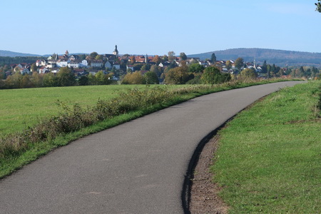Der Radweg aber bleibt am anderen Ufer der Schlitz und führt abseits der Bahnstrecke über den Berg nach Angersbach. Von einem kleinenSporn grüßt die Burg Wartenberg, dann erreicht man wieder die aktive Bahnstrecke, die im Tal der Lauter verblieben war.