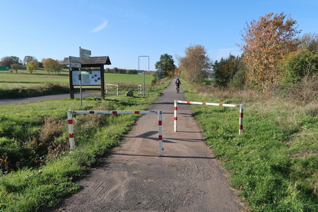 Die Wegweiser sind einwandfrei, noch verläuft der Radweg neben der zugewachsenen Bahntrasse.