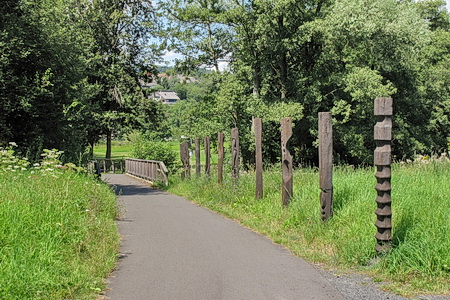 Links halten über die Brücke! Hier stehen die Originale der Stelen aus den alten Eisenbahnschwellen.