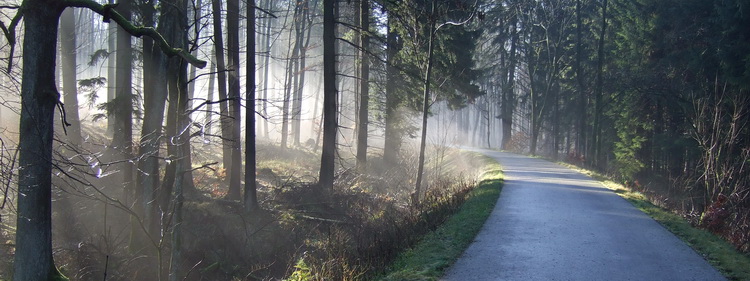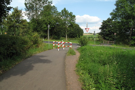 In Hartmannshain, in 565 m über dem Meeresspiegel, beginnt eine lange und stetige Abfahrt. Als nächstes muss die B 275 überquert werden. Die Umfahrungsspuren der eng stehenden Sperren sollten zu Denken geben.