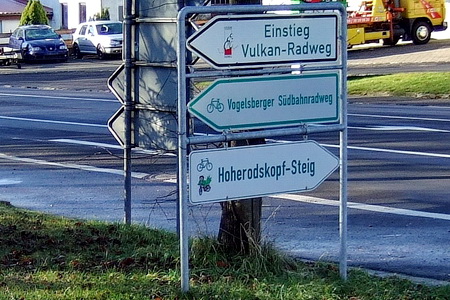 Der Radweg auf der Bahntrasse endet hier. Aber die Beschilderung des Vulkanradwegs führt weiter nach Altenstadt - noch 10 km, an der aktiven Bahnstrecke entlang.