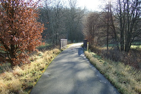 Die Brücke über den Mühlbach in Gedern ist ein kurioses Bauwerk (Blick zurück). Der Vulkanradweg bietet nun zwei Optionen; die Schlossroute oder die Hauptroute. Alles ist sehr ordentlich ausgeschildert.