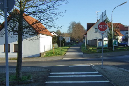 Nun geht es hinunter nach Gedern. Die zwei großen Schleifen zur Überwindung des Höhenunterschieds erfordern auch eine mehrfache Überquerung des Mühlbaches. Bemerkenswert und zur Nachahmung empfohlen: An den kleineren Querwegen hat der Radweg Vorfahrt!