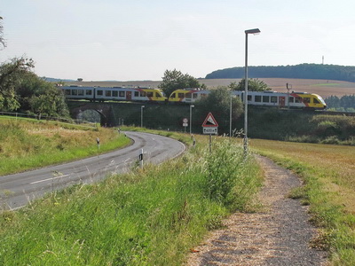 Ein Zug der Taunusbahn rauscht vorbei. Es geht bergab, noch 300 m bis zum Bahnhof.