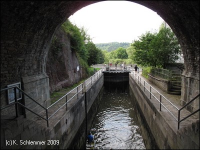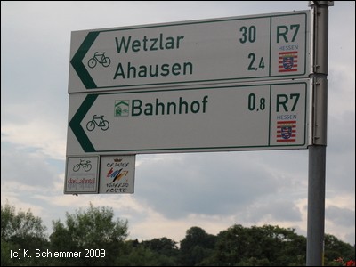 Die Beschilderung ist normgerecht, darunter befinden sich die Einschublogos "das Lahntal" und "Oranier-Fahrradroute". Ein Hinweis auf den "Weiltal Weg" fehlt. Man folgt dem Lahntalradweg entlang der Schleife um den Ort und erreicht bald den bekannten Bootstunnel mit seiner Doppelschleuse.
