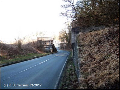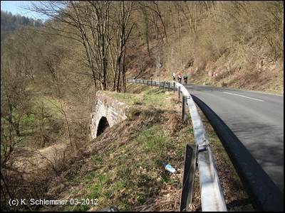 Richtung Ernste Mühle entlang der Straße geht es an einer alten Brücke der Bahnstrecke vorbei.
