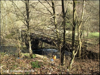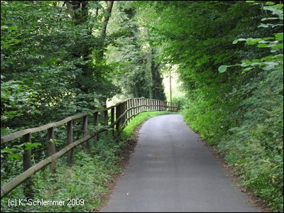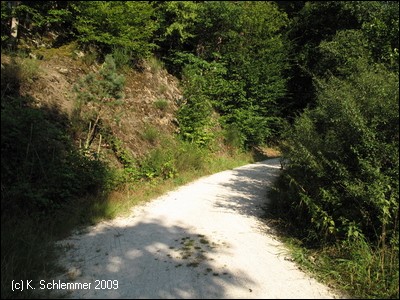 Nur ein kurzes Stück ist asphaltiert, dann wird`s ein Waldweg. Auch die Bahntrasse hat die Weil überquert, die alte Brücke ist durch das Gestrüpp zu sehen. Wir sind nun auf der Bahntrasse.