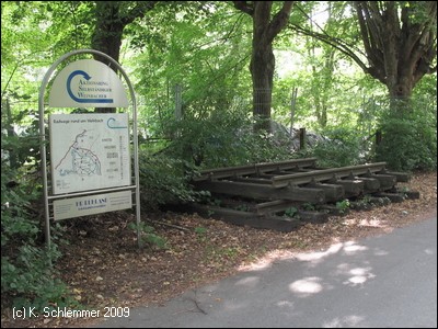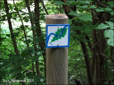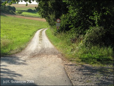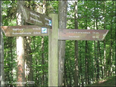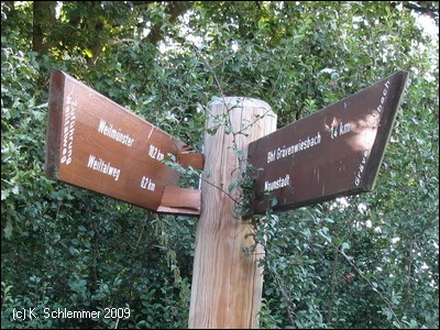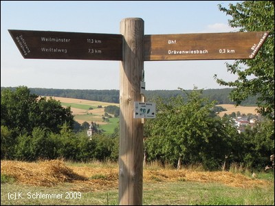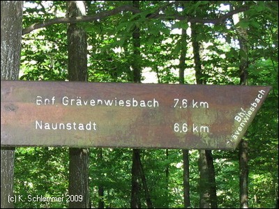 Es folgt eine wunderschöne Strecke allerdings aufwärts durch den Wald. Schließlich biegt die Strecke rechts ab über die Felder Richtung Naunstadt. Der Wegweiser ist stark beschädigt (2009). In Naunstadt geht es noch einmal kräftig bergauf über die Kuppe, die Bahnlinie der Taunusbahn wird unterquert.