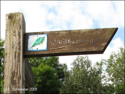 Die L3323 muss überquert werden, dann tauchen die Wegweiser des Weiltalwegs auf. Die nicht normgerechten Schilder sind teils schlecht lesbar, besonders ohne anzuhalten. Das einheitliche Logo hilft bei der Orientierung.