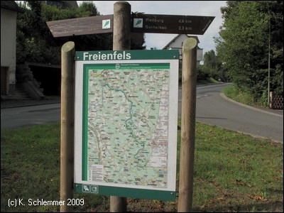 Infotafel mit Landkarte in Freienfels, die Burgruine ist vom Radweg aus nicht zu sehen, aber von der Straße (L 3025) aus. Es geht weiter durch den Wald.
