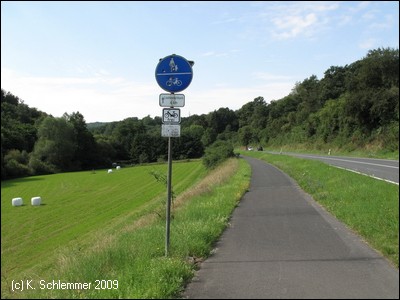 Bis zum Freibad ist der Radweg breit ausgebaut und asphaltiert. Die Schilder sind in die Jahre gekommen.