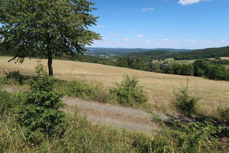Östlich von Mademühlen verlässt der Radweg die alte Bahntrasse. Ein Asphaltweg führt über den Hügel. Der Wald ist von der Trockenheit stark beschädigt. Es geht hinab nach Driedorf.